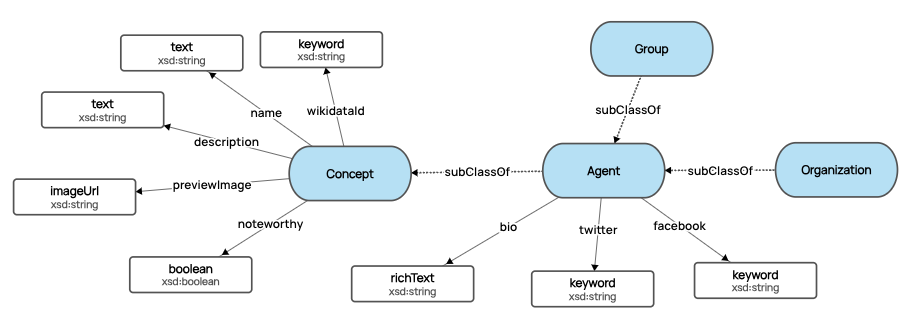 For clarity, when I talk about the graph model (ontology) I am explicitly talking about the classes (entity/node types) and property definitions that semantically and logically describe the instance data in a knowledge graph or graph database, as distinct from any instance data. We often visualize domain models in the style below, showing classes, relationships and properties; it is a very object-oriented way of representing a domain, and largely technology agnostic.