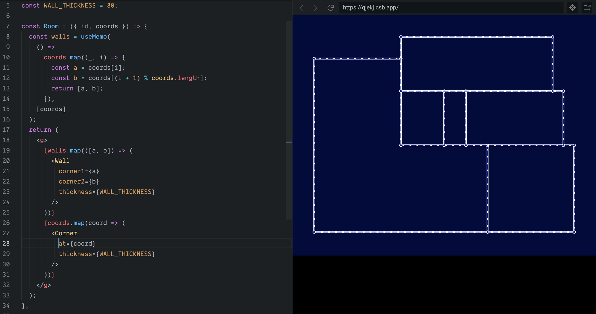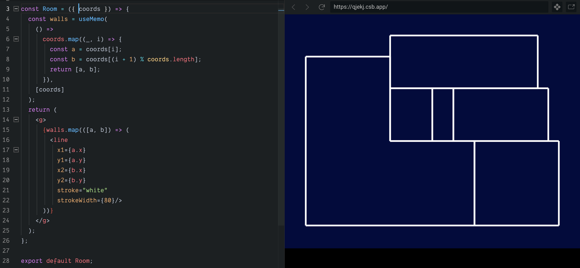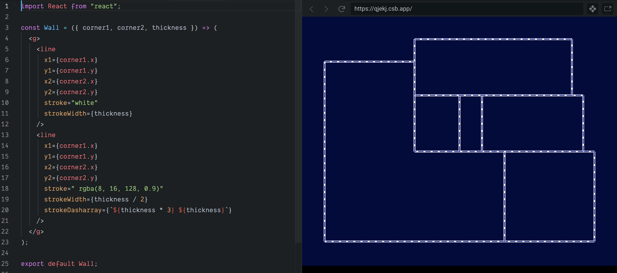 );Now drawing the walls is as simple as using the SVG <line> element to describe a line between the pairs of connected corners.