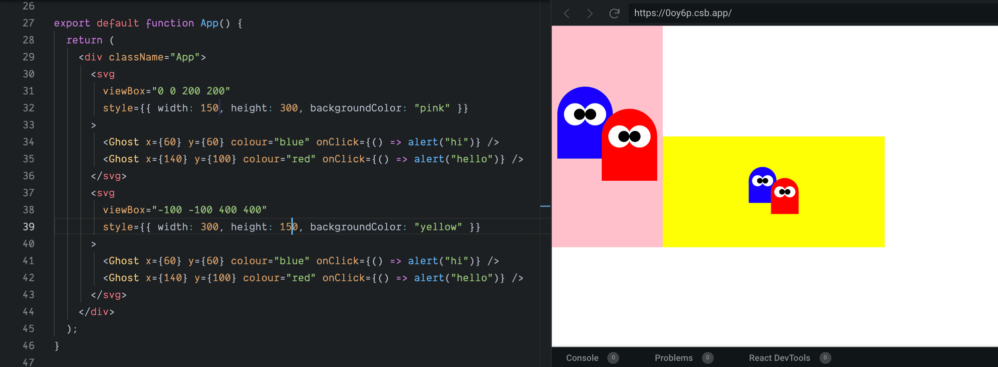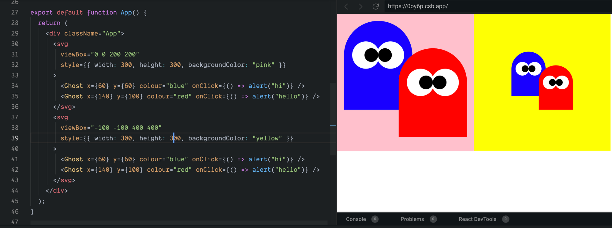The only difference between these two SVG’s is the viewBox and the background colour (https://0oy6p.csb.app/)