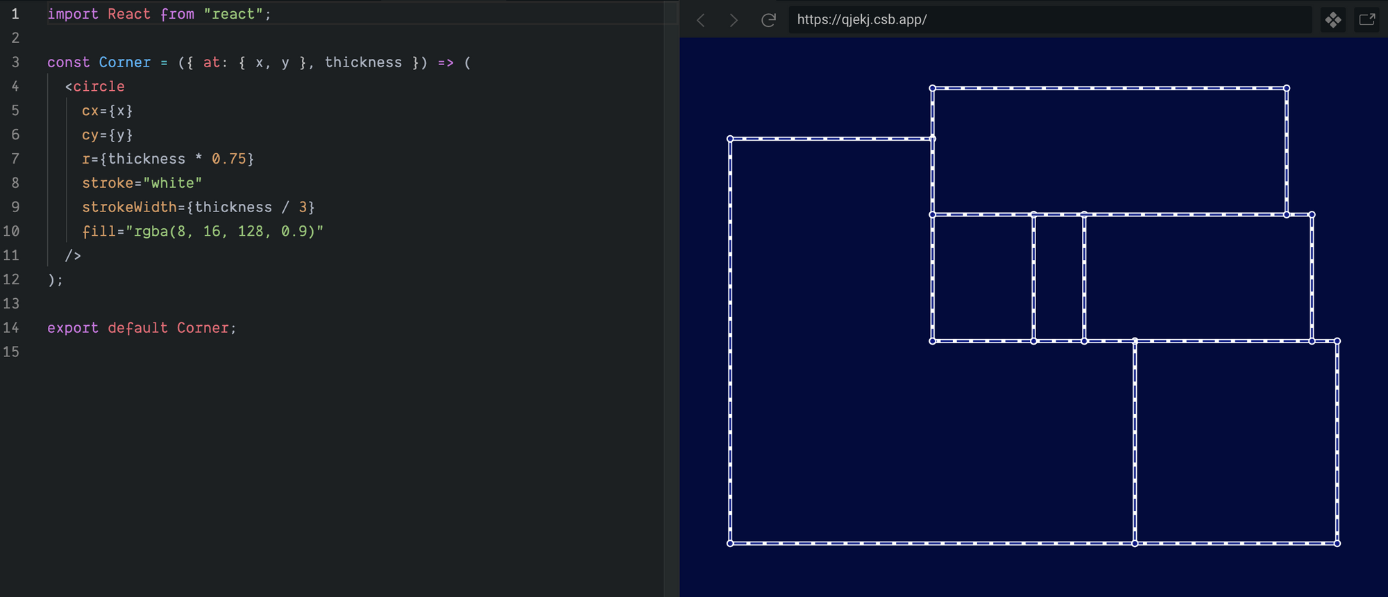 In our wall component we’re now drawing two lines per wall — first a thick white line, then over-drawing the white line with a thinner, dark blue, dashed line.Corner is very simple — just a circle, stroked white and filled dark blue.