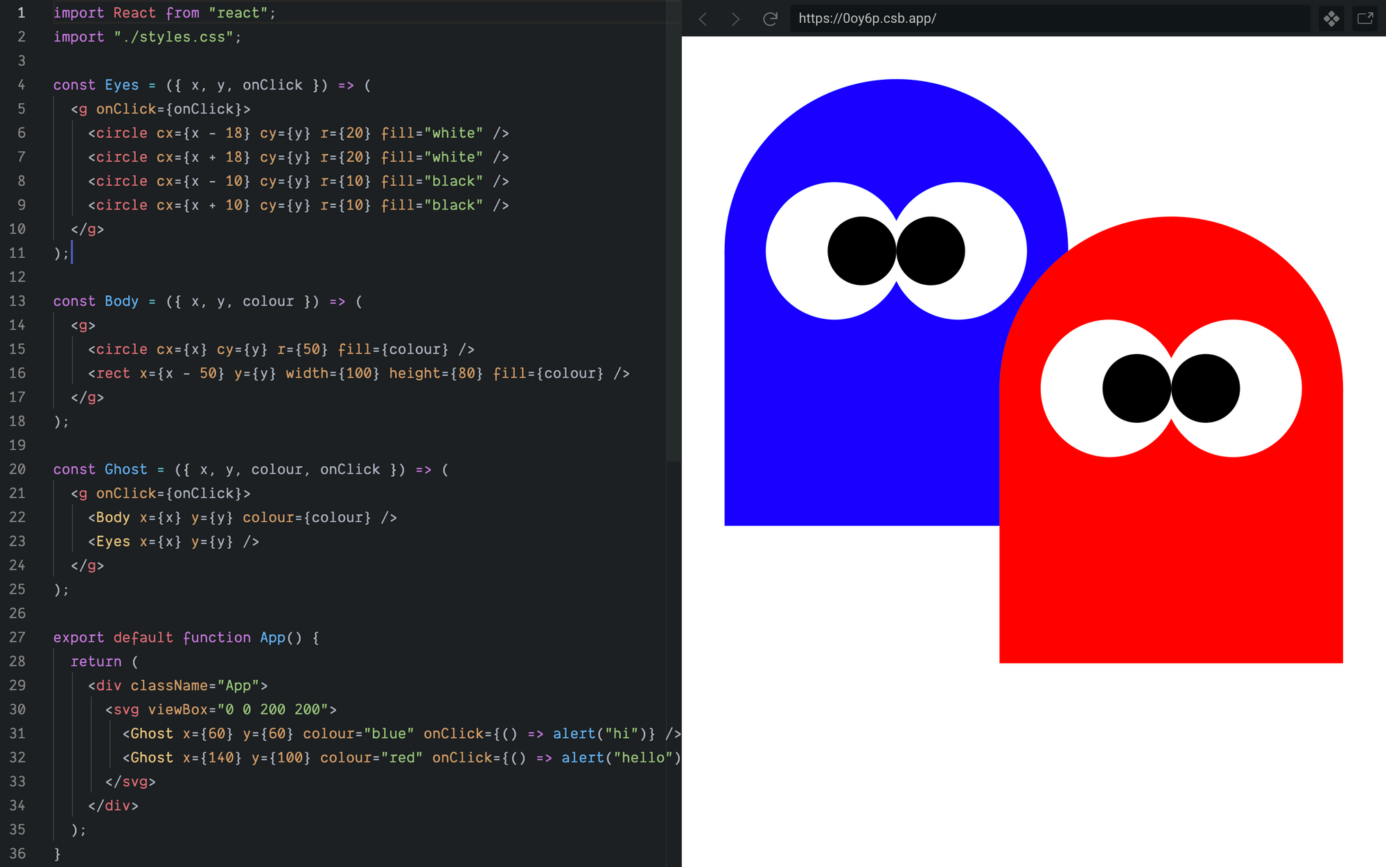 Notice that we did all this drawing without a single line of imperative code, and the declarative markup of our ghosts is very readable and accessible to anyone familiar with React — a far cry from what this would look like if we tried to do it with the Canvas API.
