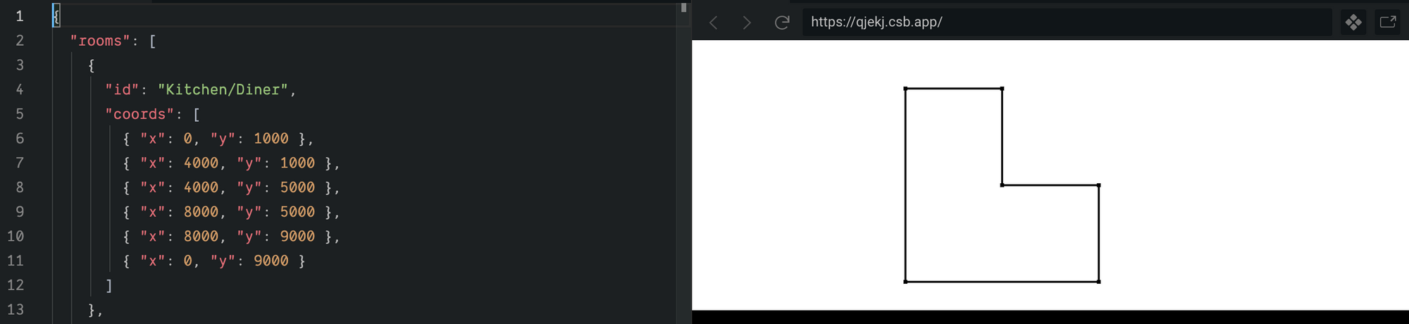 We’ll describe our floor-plan with some simple JSON, specifying the room geometry as coordinates of corners working clockwise around the room.