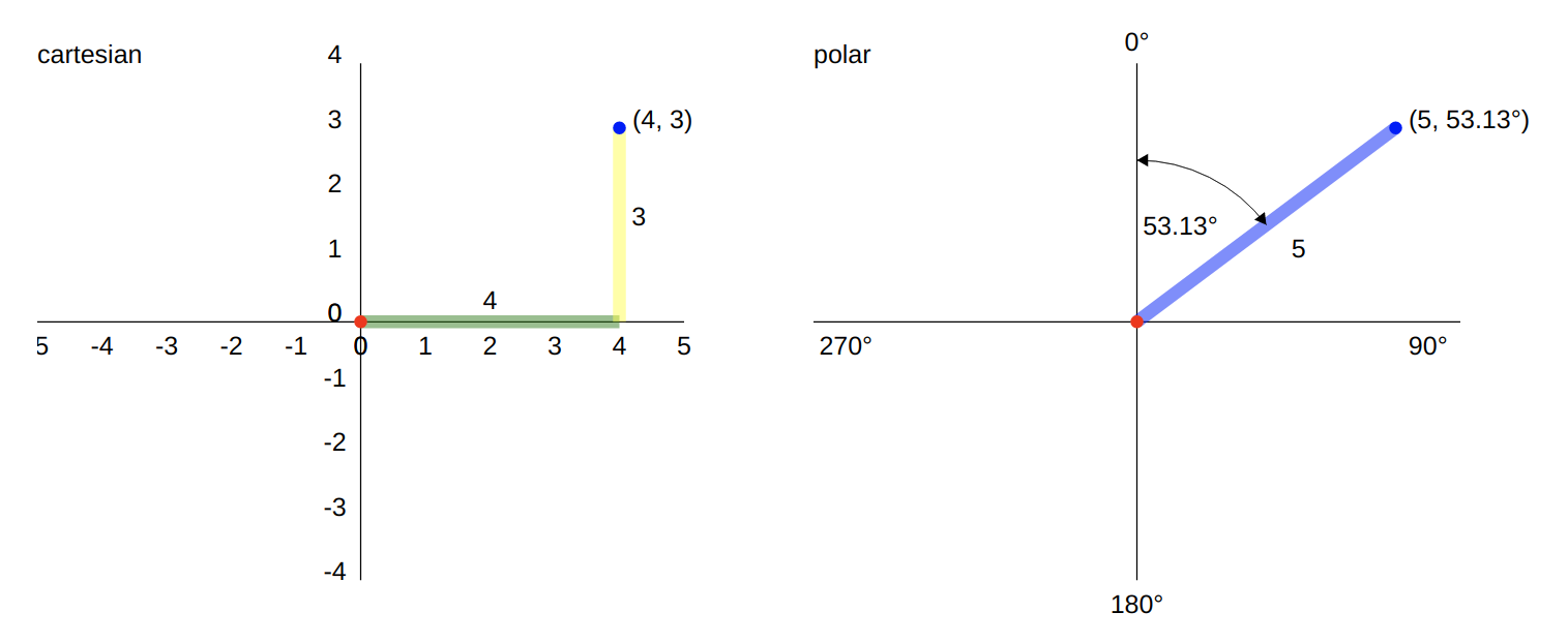 Using polar coordinates, the Cartesian point [x, y] can be expressed instead as a distance from the origin or “pole” and an angle offset from a reference angle, i.e. instead of [x,y] we have [distance, angle].The same point represented in Cartesian and polar coordinates