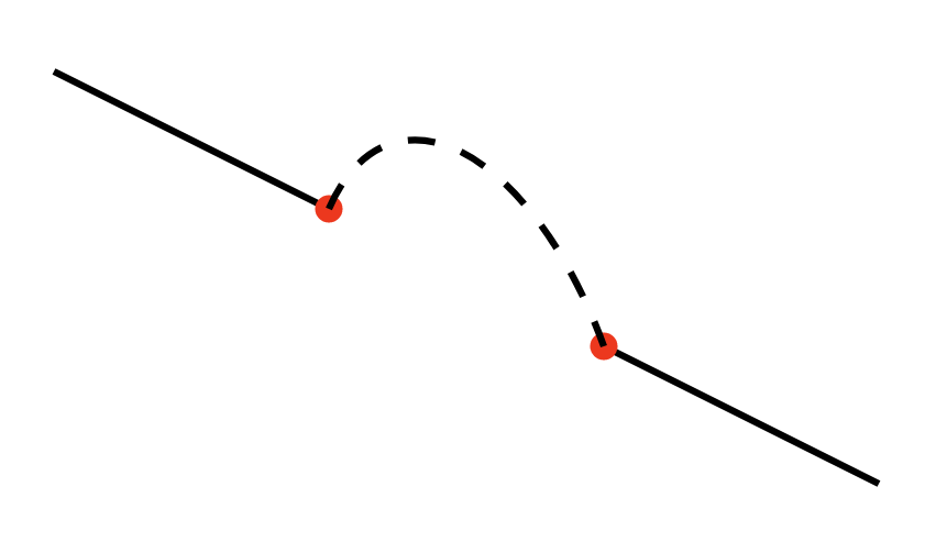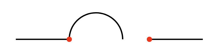 M20,50 L40,50 A10,10,0,1,1,70,50 L90,50Here we’ve specified a horizontal line, followed by circular arc (rx and ry are equal, both 10), that spans the gap from the start point at 40,50 to the end point at 70,50, followed by another horizontal line… but wait, the math doesn’t work out — a radius of 10 means the arc will only bridge between two points that are 20 units apart, but our start and end points are 30 units apart! Logically it seems like this might produce the disconnected path shown below:conflicting arc parameters ... what would it draw?