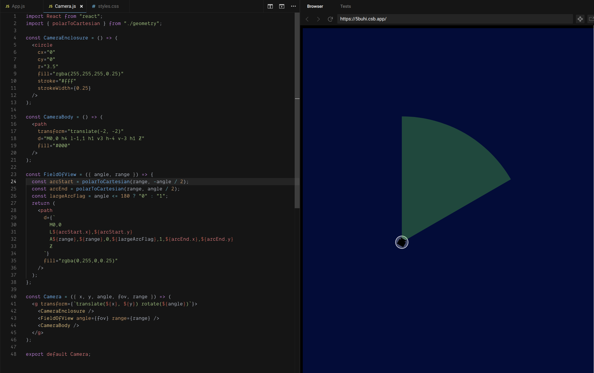 A${range},${range},0,${angle > 180 ? "1": "0"},1,${C.x},${C.y}And the Camera component, complete with FieldOfView, now looks like this:https://5buhi.csb.app/