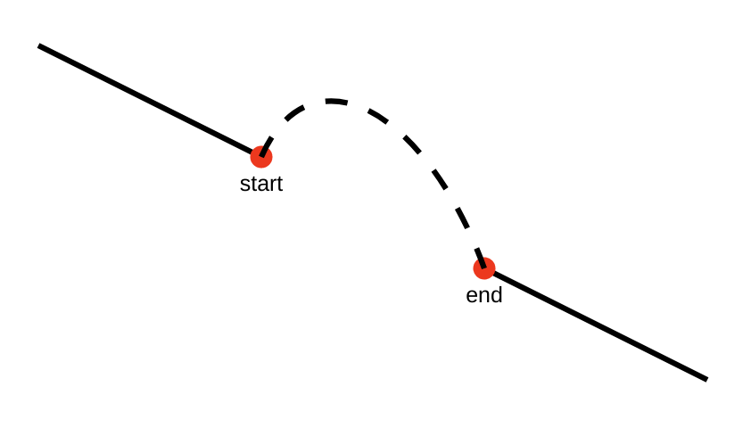 One last thing I want to mention, which the mathematically inclined may have spotted, is how on earth would you go about making sure that for the given rx, ry, and x-axis-rotation, the ellipse actually will touch both the start and end point? To illustrate what I mean, consider the path below:
