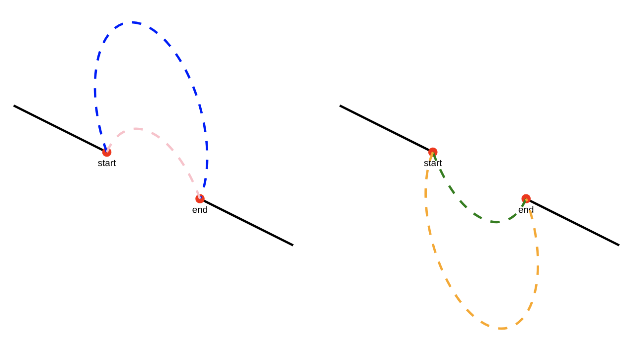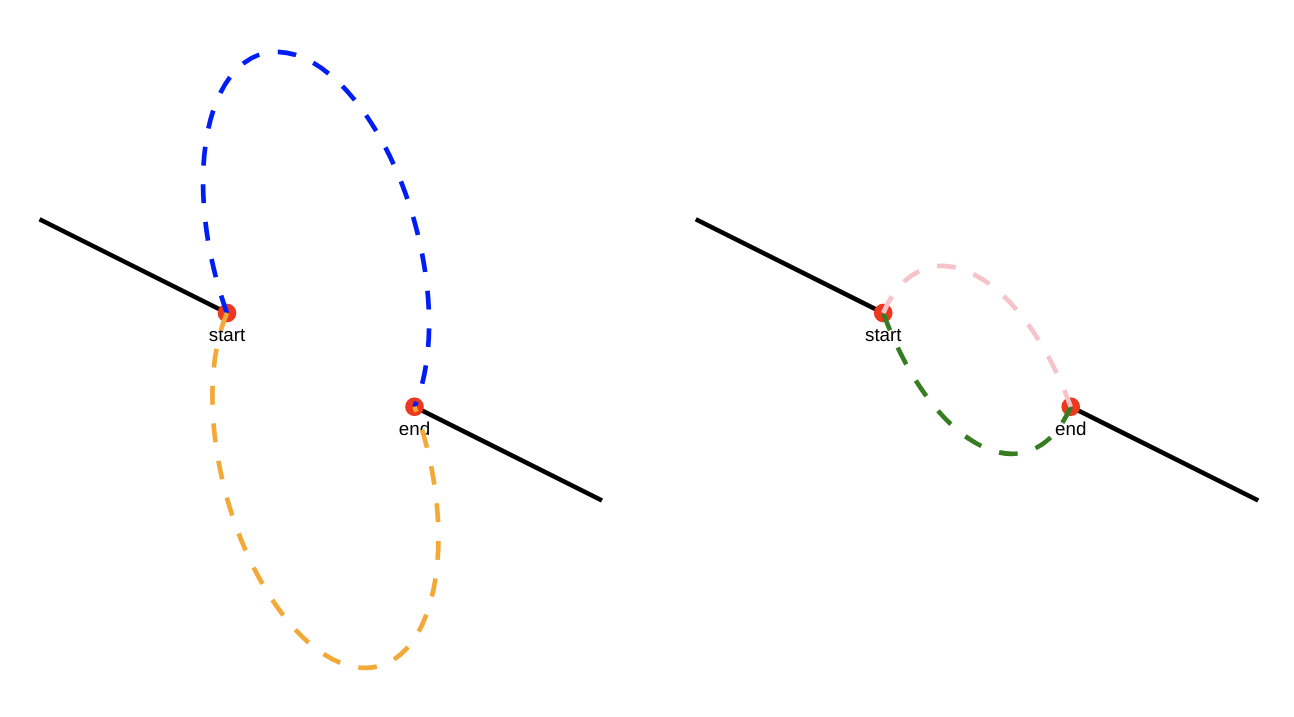 From the diagram above its easy to guess what the large-arc-flag is for — it specifies whether we mean to take the long way around (the larger arc, blue or orange in our diagram) on whichever ellipse, or the shorter arc (pink or green). Setting the large-arc-flag to 1 will send us around one of those two longer arcs (blue/orange), while 0 would pick the shorter (pink/green) arcs instead.possible arcs when large-arc-flag=1 (left), and large-arc-flag=0 (right)