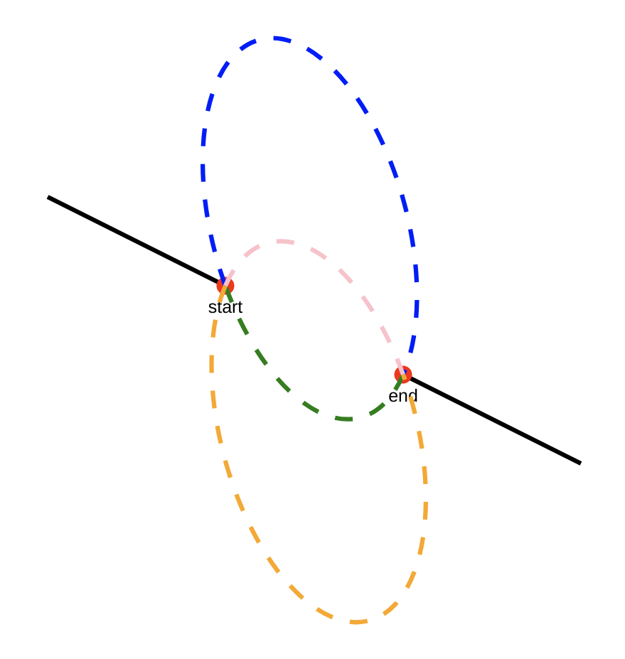 In fact, at this point there are 4 possible arcs that we could mean, made from two possible arc-segments of two possible ellipses! Consider the diagram below.Erk! Which arc-segment of which ellipse did we mean?