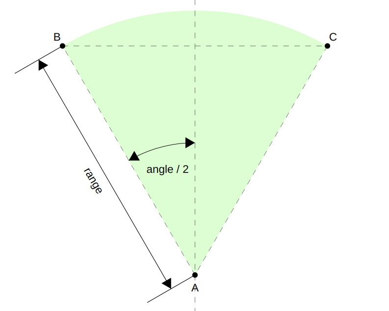We can get a feel for how the props relate to the rendered field of view from the diagram below. Remember that the camera is drawn pointing upwards, so the mid-point of the field of view needs to be directly up the y-axis from the origin.How the range and angle props relate to the rendered field of view