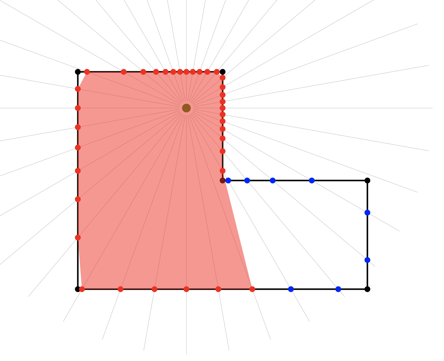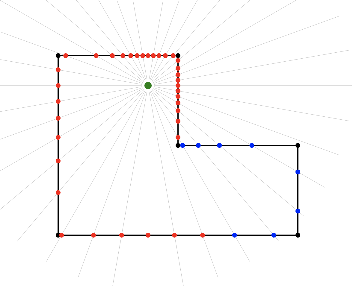 In our case, however, we know that each room is composed of a very small number of segments (walls) so we can take a different approach: rather than sweep through 360 degrees, we can check only the angles to known segment end-points, which reduces the number of calculations we need to make, and simultaneously allows us to achieve very high precision at little cost.