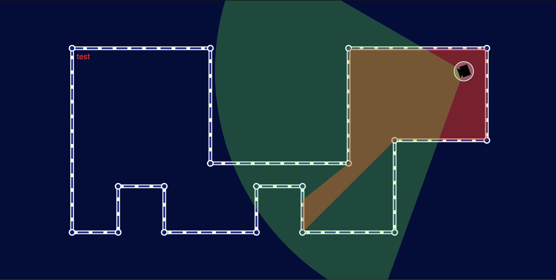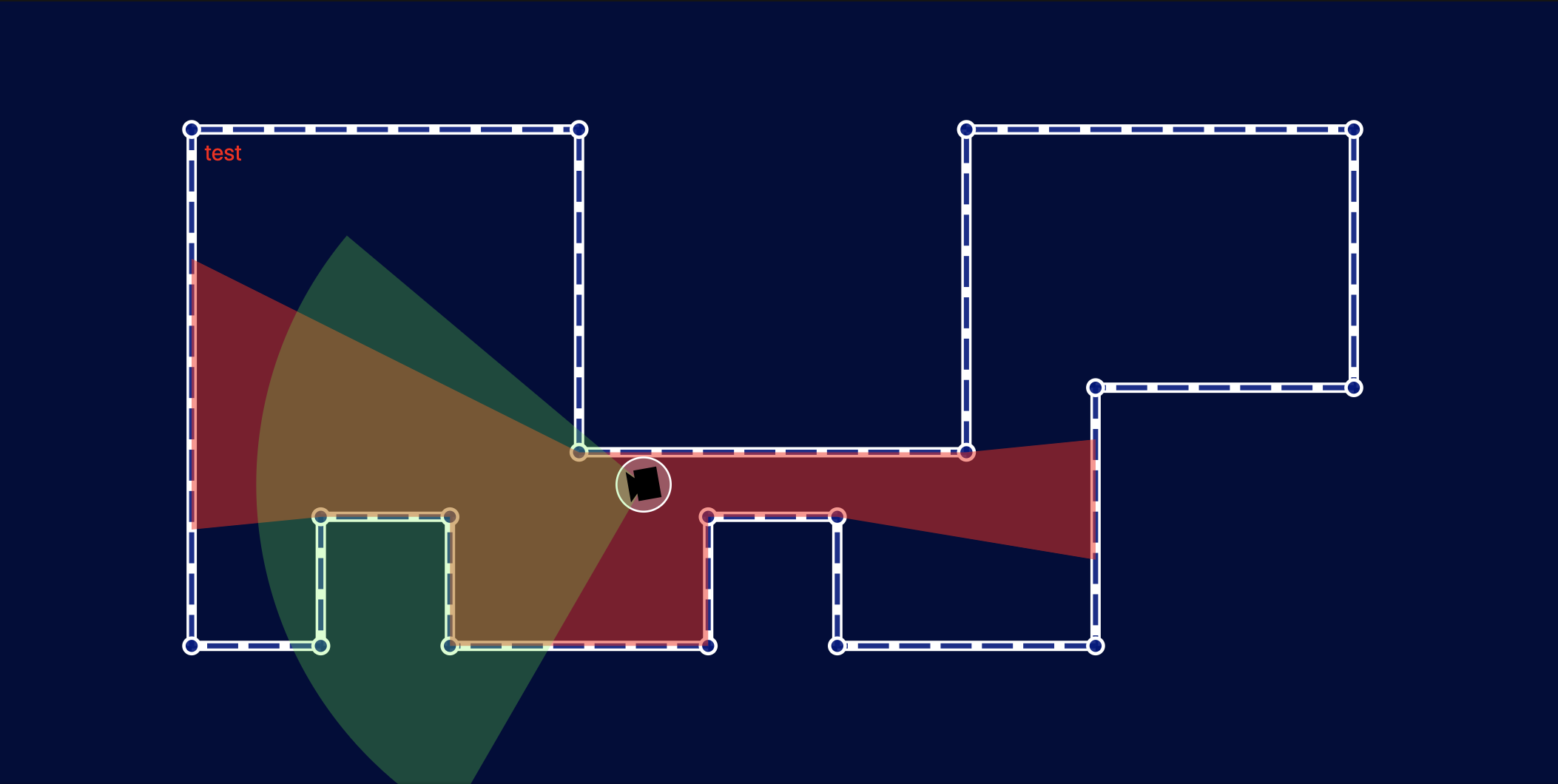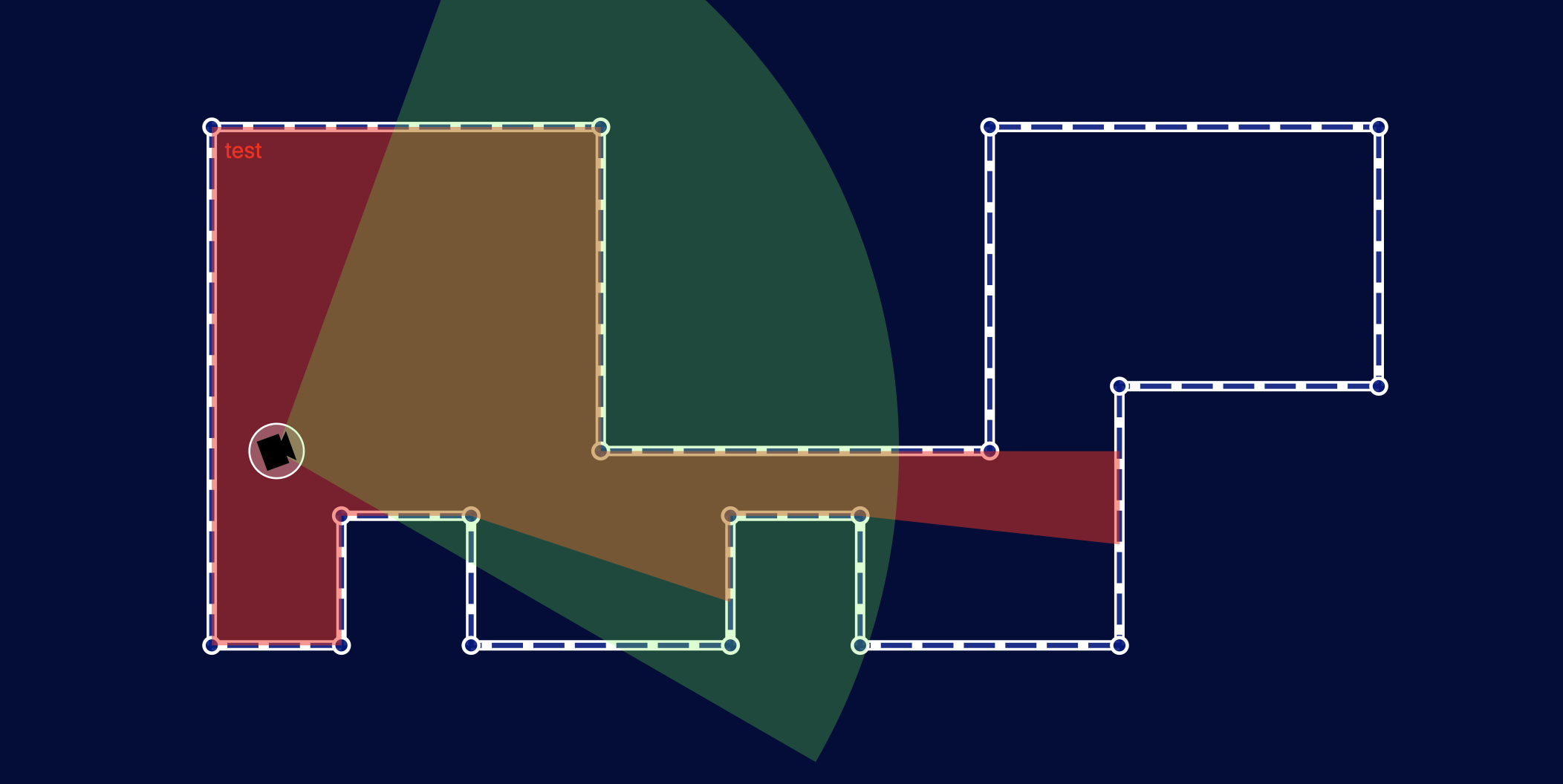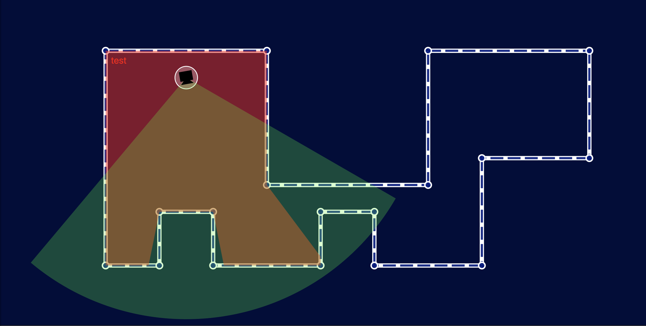 Whew, that got a little heavy, but we now have a clean, simple, and fast mechanism for finding the visibility polygon from any given point in a room, and we can use that visibility polygon as a clip-path to constrain the camera field of view in a realistic manner.