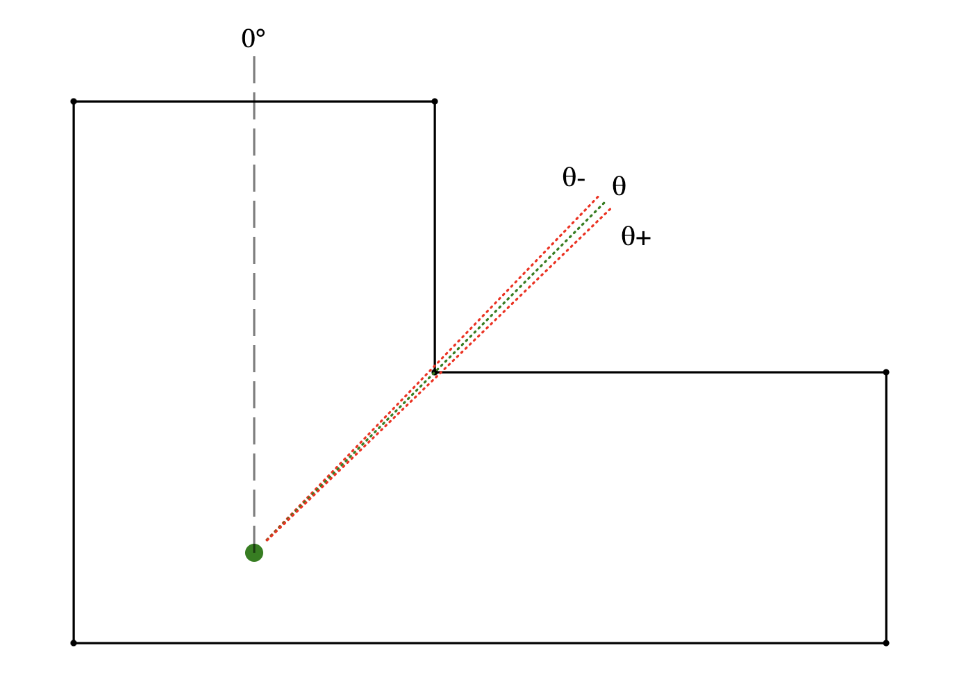 θ-andθ+to either side ofθ, whereθ-is a fraction smaller than (CCW of)θandθ+is the same fraction larger than (CW of)θ. - For each angle in the resulting list, find the nearest wall intersection and add it to our visibility polygon