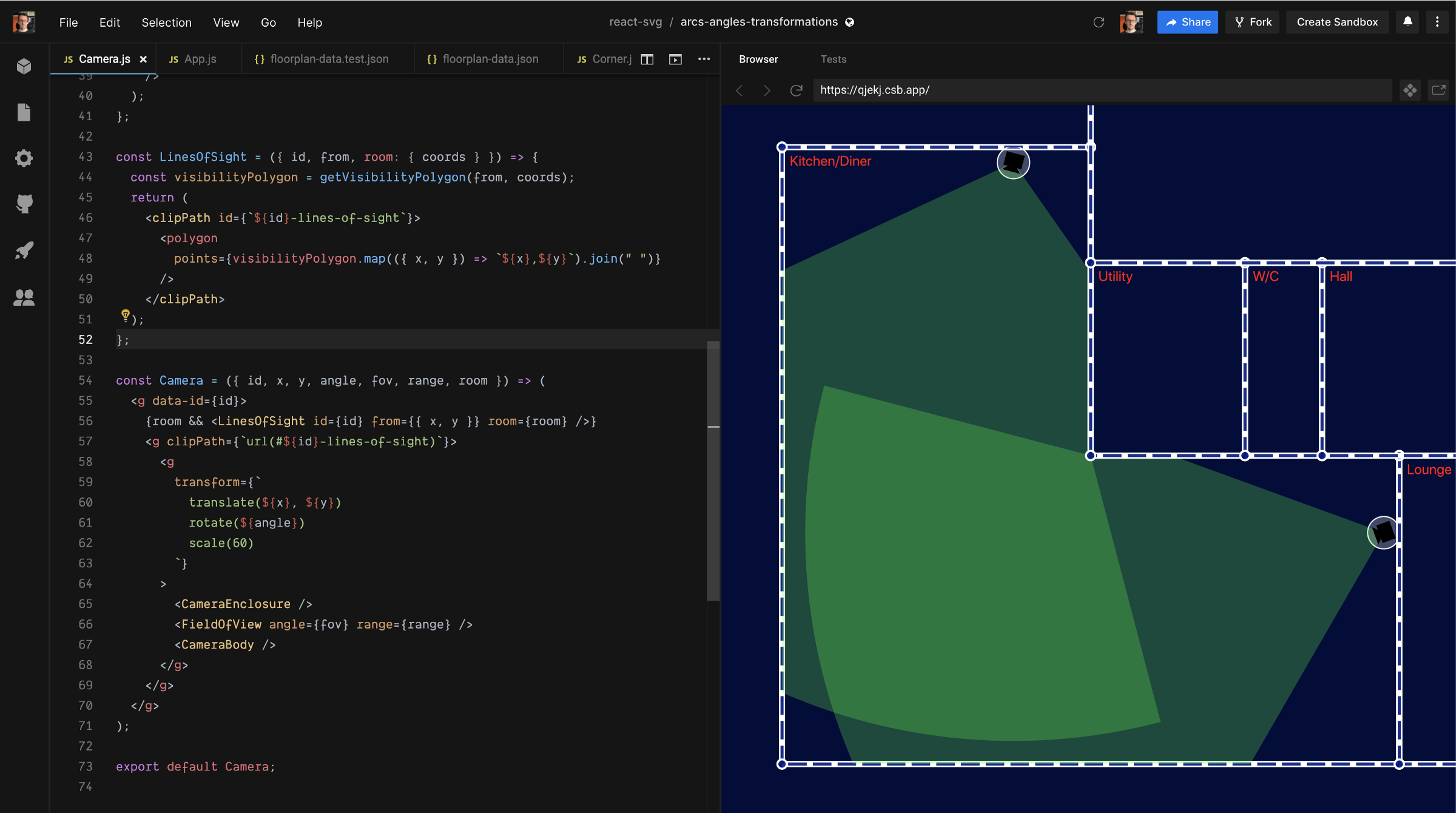 <polygon points={coords.map(({x,y}) => `${x},${y}`).join(" ")}/></clipPath>Now all we need to do is add the clipPath attribute to our camera group to apply the clip-path.
