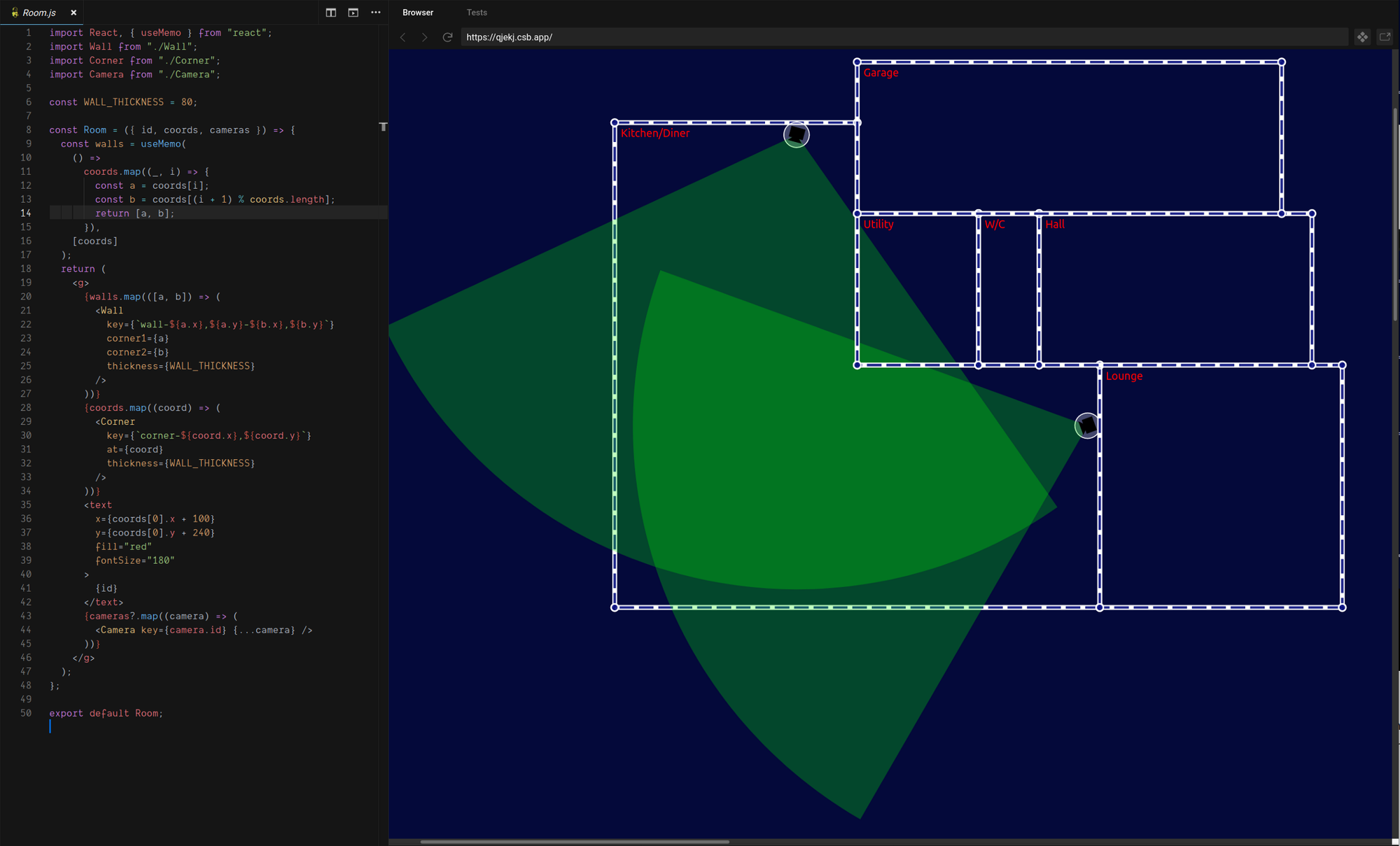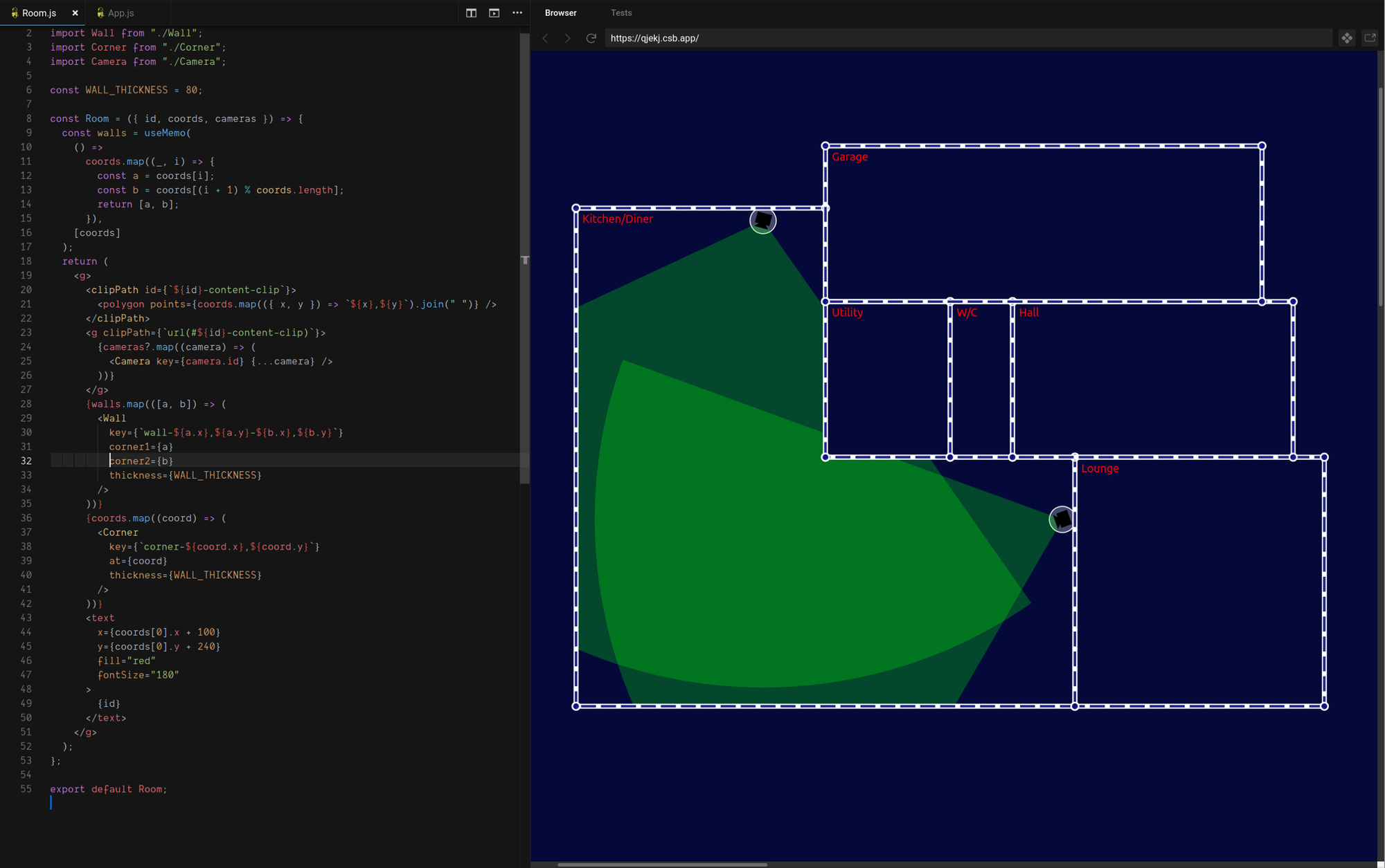Back to the floor-plan. Our Room component currently renders as a group<g> containing walls, corners, and cameras (and I added the room name as red text in the corner of each room). Here’s the current code and its output: