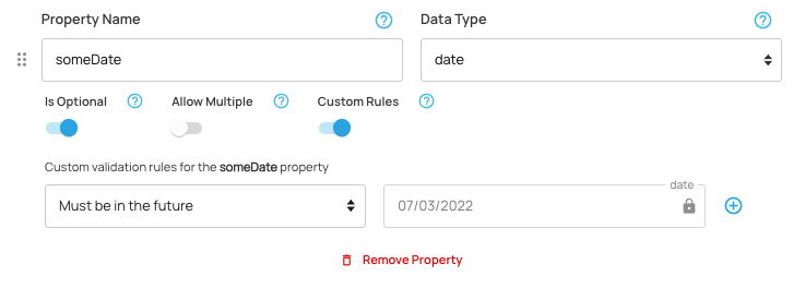 When creating a property, custom validation allows you to choose from a set of configurable rules that can be applied to certain data types and used to control the property’s data, for example an age limit, an expiry date or a control on input text. These rules include min/max characters (for text, keyword types), regular expressions, before/after date (for date, dateTime) and min/max value (for integer, decimal, latitude, longitude). You can also define cardinalities on arrays and relationships in the graph.