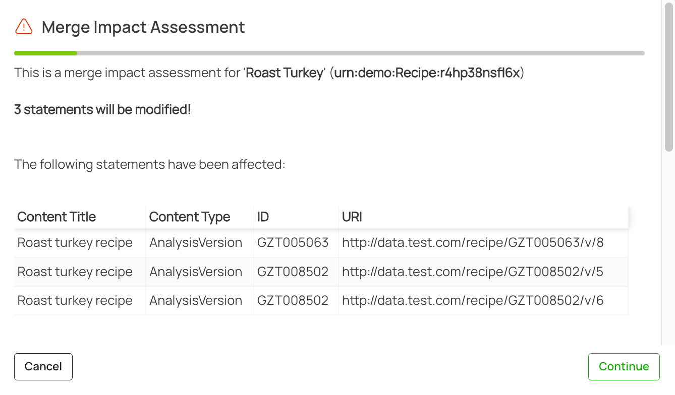 Data Graphs pre-commit web hooks allow you to perform a remote impact assessment of a given event, for example, merging two Concepts, or deleting a Concept when integrated with some target business system. When one of these actions occurs, Data Graphs makes an HTTP request with the event’s details in the payload to an endpoint in your environment, allowing you to analyse the downstream impact of this change and respond by either accepting or declining the event or by providing a warning (as illustrated). A full integration of these at Cochrane has been discussed in this case study here.