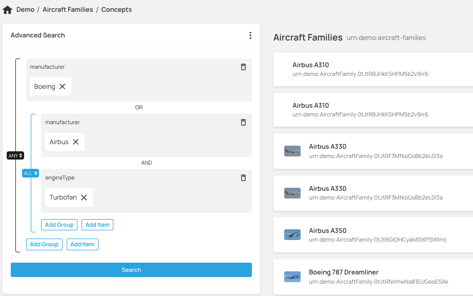 Data Graphs Advanced Search feature allows you to build complex queries by chaining and grouping a series of boolean and numeric expressions. For example for finding a set of concepts in the graph where they are of Type A and Type B or Type C, with a date property after a specified date, and a property equal to some specified value. These searches are available in both the Data Graphs API and now in the app too.