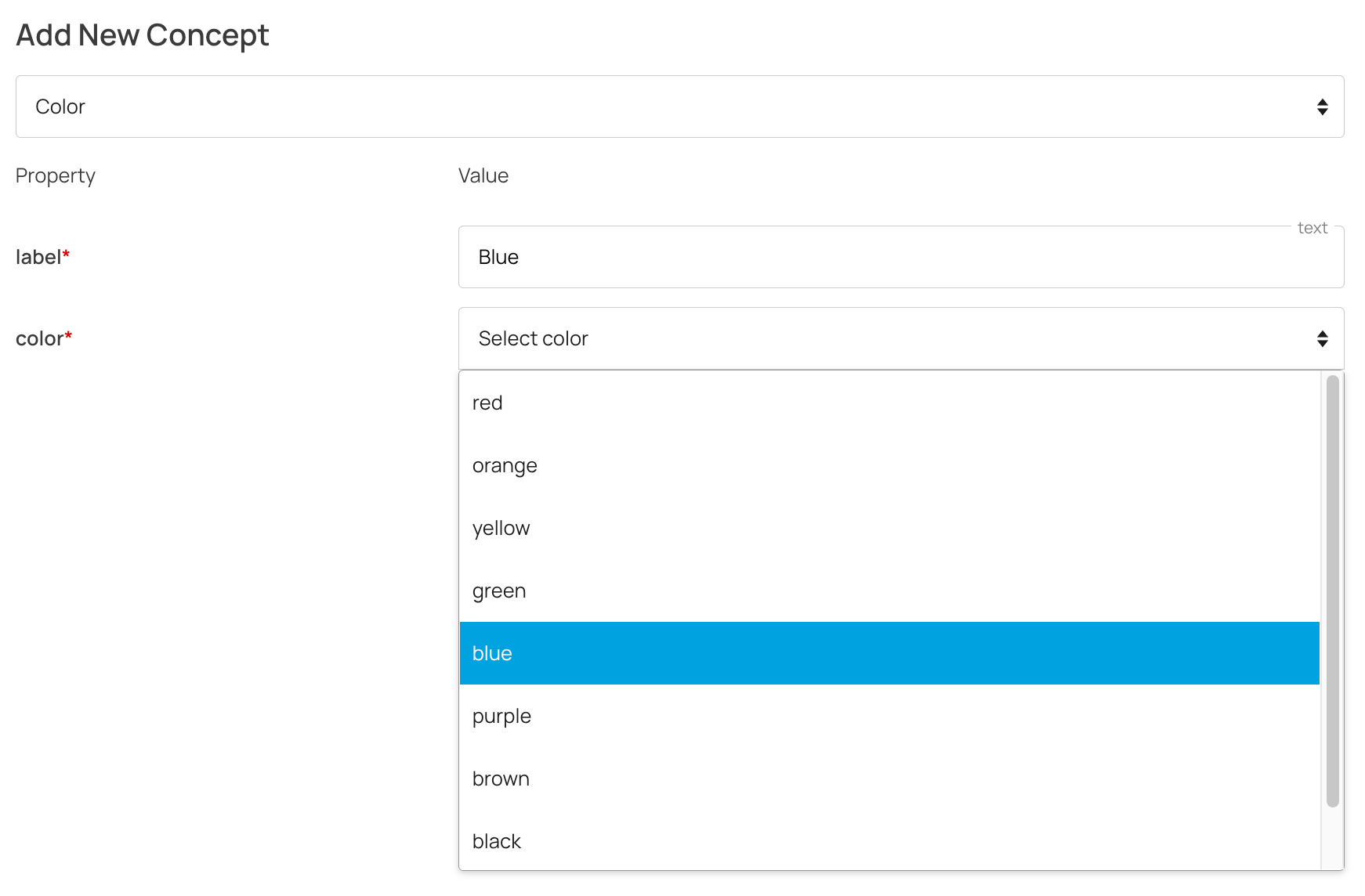 The new enum data type allows you to create a property with a predetermined list of options, from which users choose when setting its value. This will be useful for any field whose value you want to limit to a small controlled vocabulary that you may not want in your graph as entities in their own right. In the Data Graphs Concept Editor the enum options are presented as a drop-down list on the property.