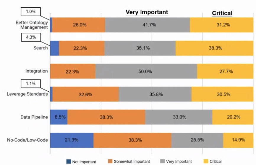 In this slide from the KG Annual Survey, you can see the areas here that reflect what knowledge graph users are interested in, for example 'Search', 'Better Ontology Management', 'Integration' and 'No-Code/Low-Code'.
